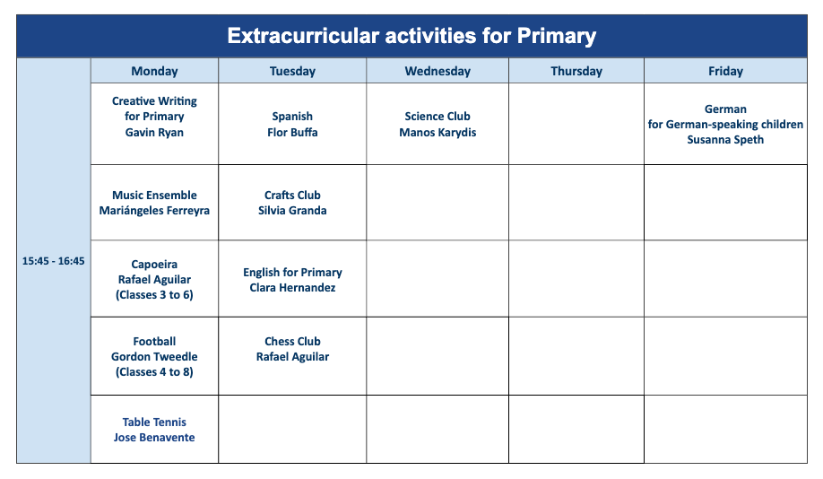 Students are welcome to try any of our extracurricular activities before committing. Advance registration is required by emailing extracurriculars@altea-international-school.es. Participation will not be permitted without prior registration. Following the trial, families can decide whether to proceed with formal enrolment.
