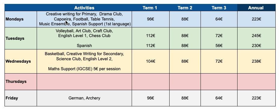 Fees: Term 1 96€ - Term 2 88€ - Term 3 64€ - Annual 223€