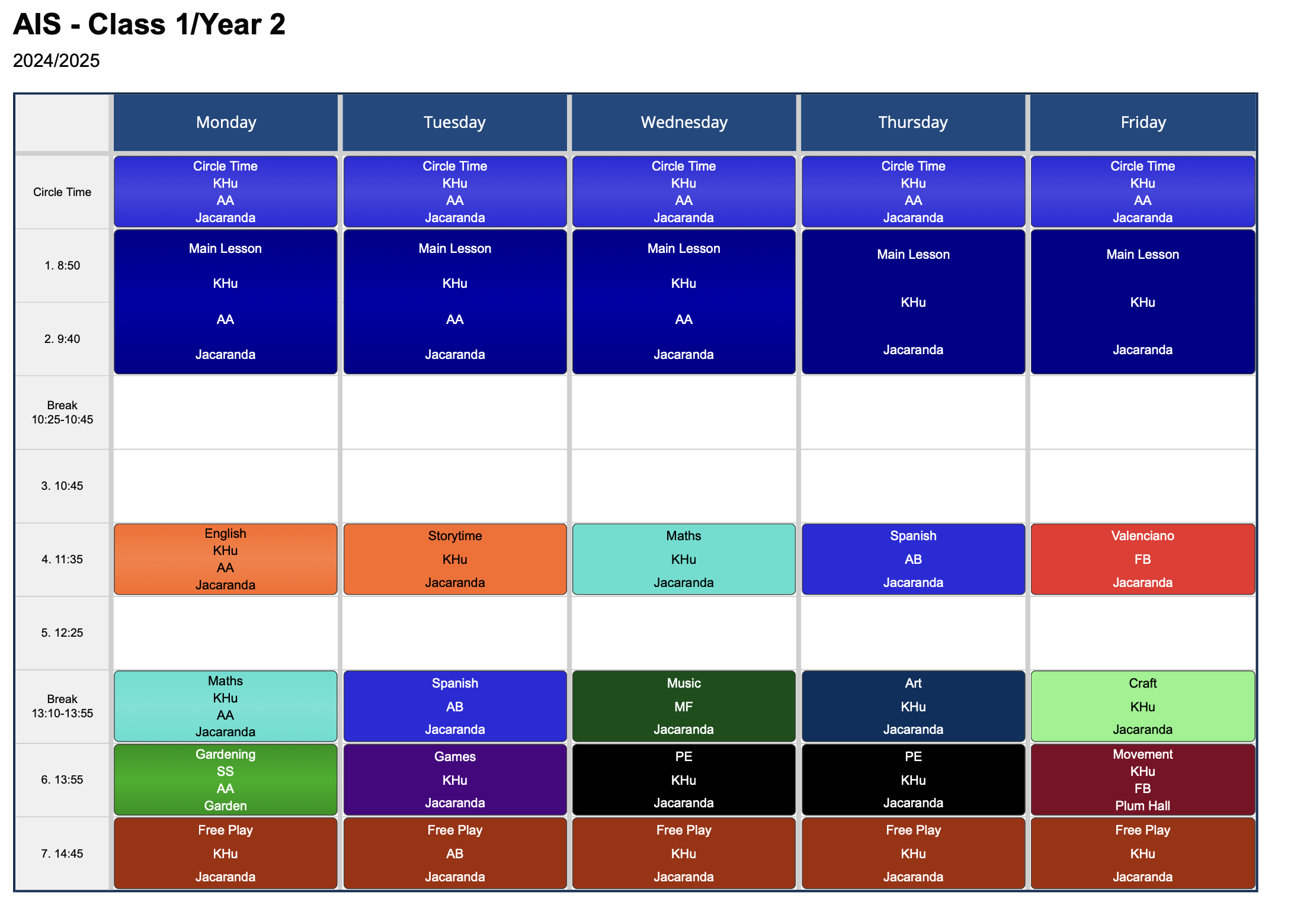 Estas clases tienen un horario fijo durante todo el año e incluyen: Matemáticas, Inglés, Ciencias, Español, Valenciano, Alemán, Música, Arte, Manualidades, TIC, Jardinería y PSHE (Personal and Social Health Education).